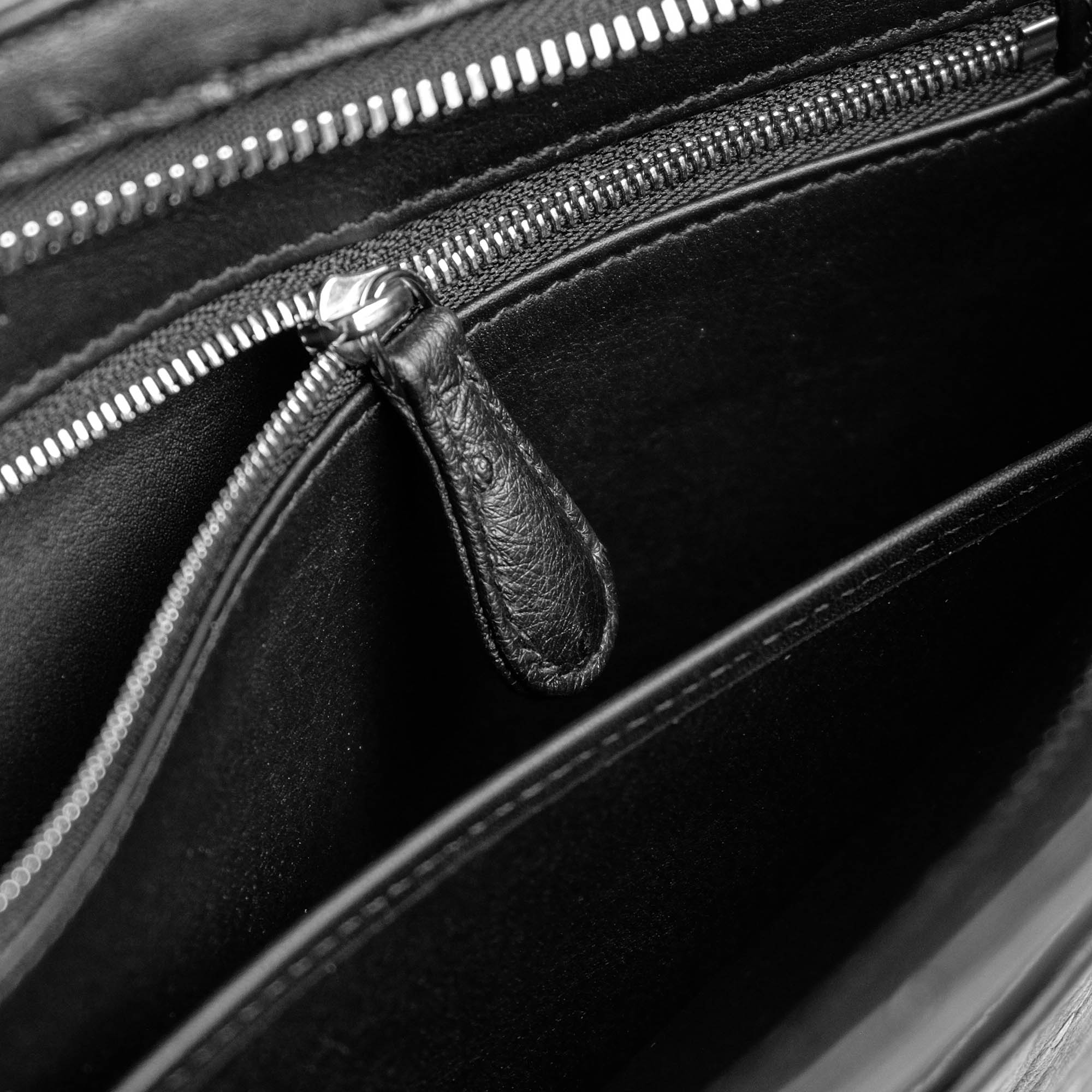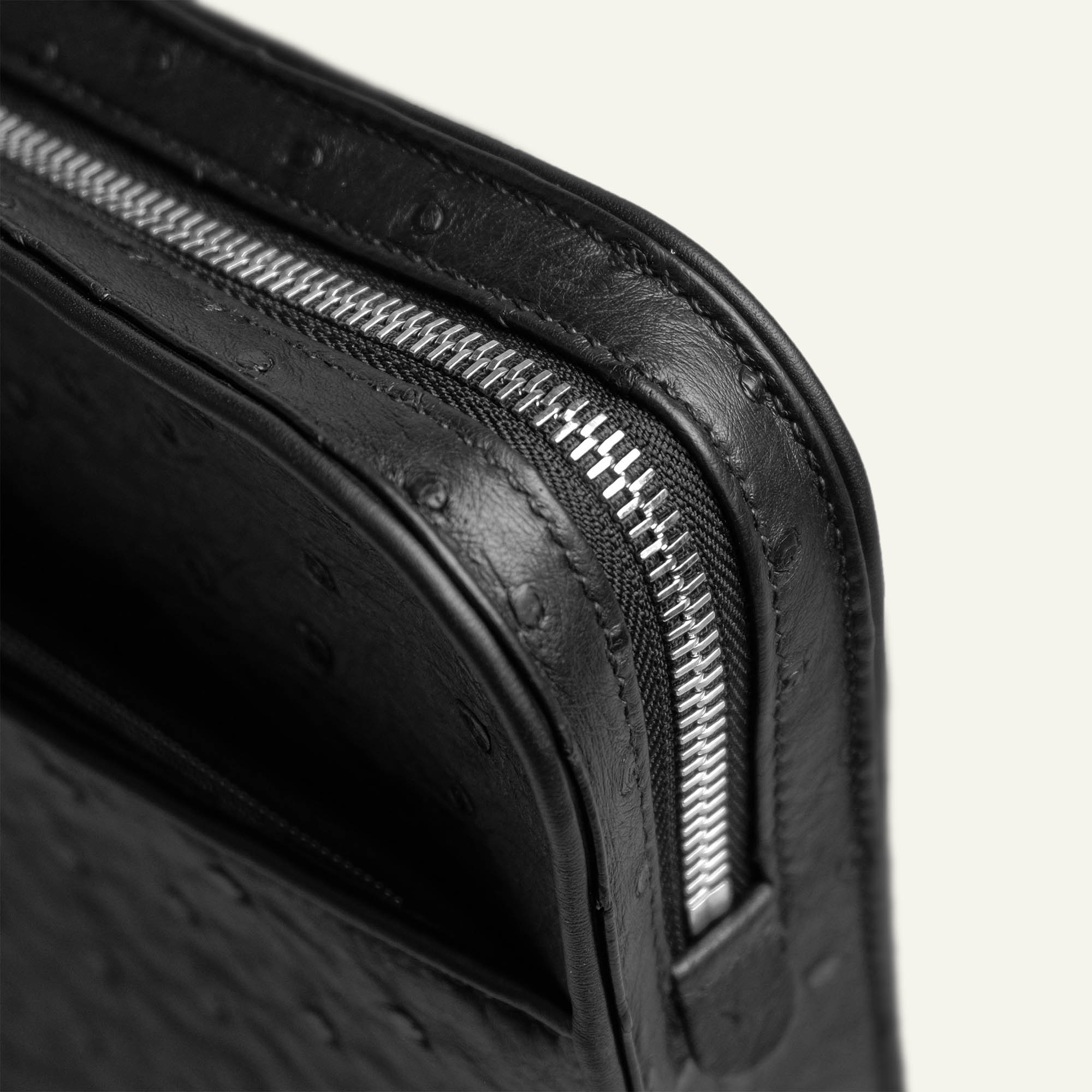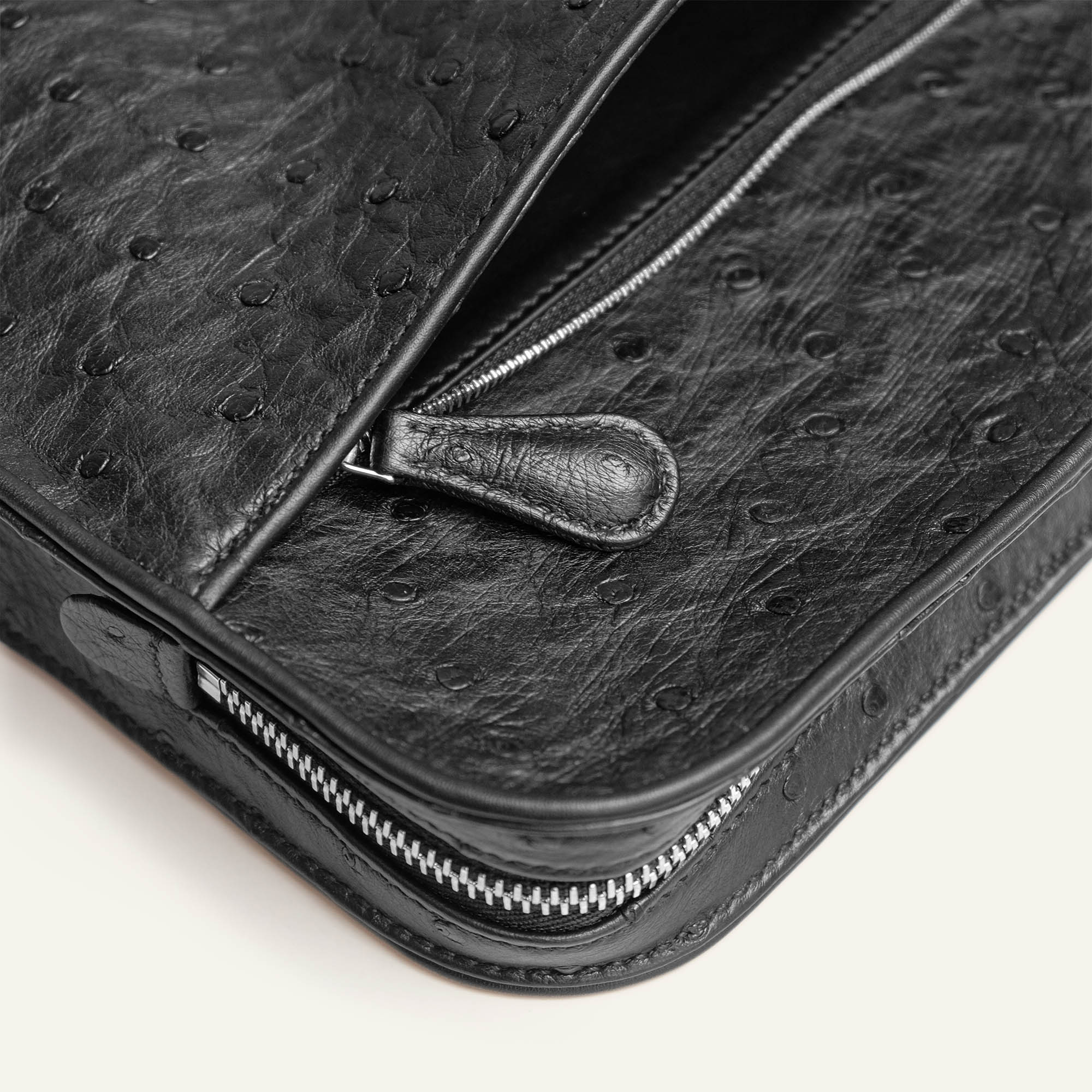 On a canvas of black ostrich leather, natural quill marks emerge like a silent rhythm — unique, unrepeatable, and rich in aesthetic depth. United with the mastery of handcraft, this material transforms into a balanced whole, where distinctive texture and refined structure coexist, embodying a quiet, effortless elegance.