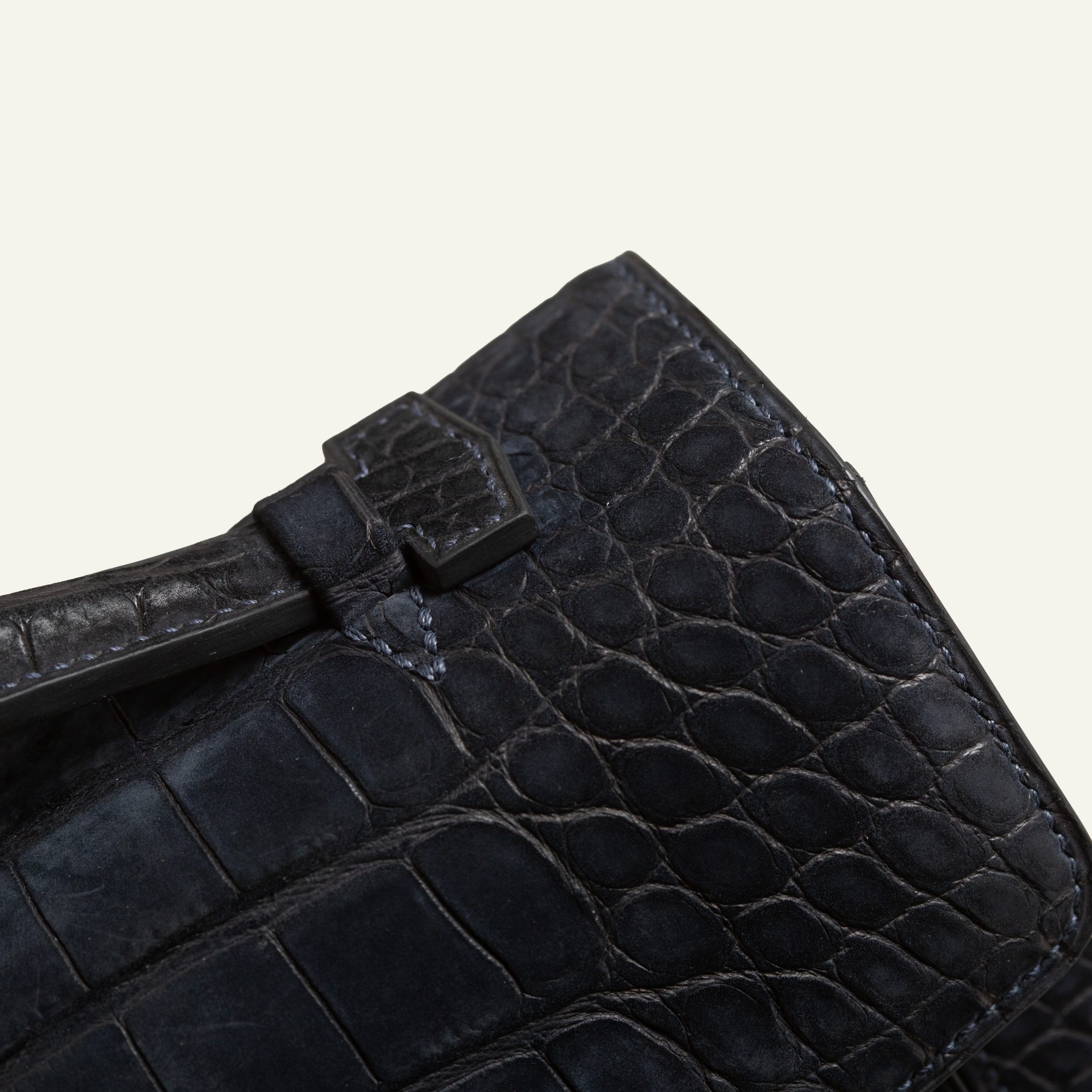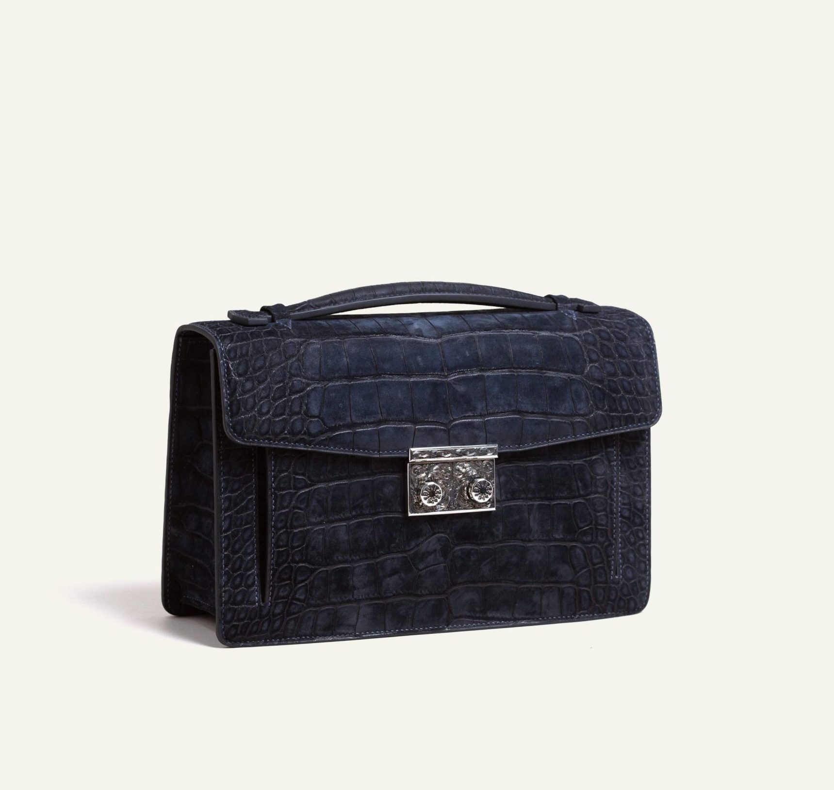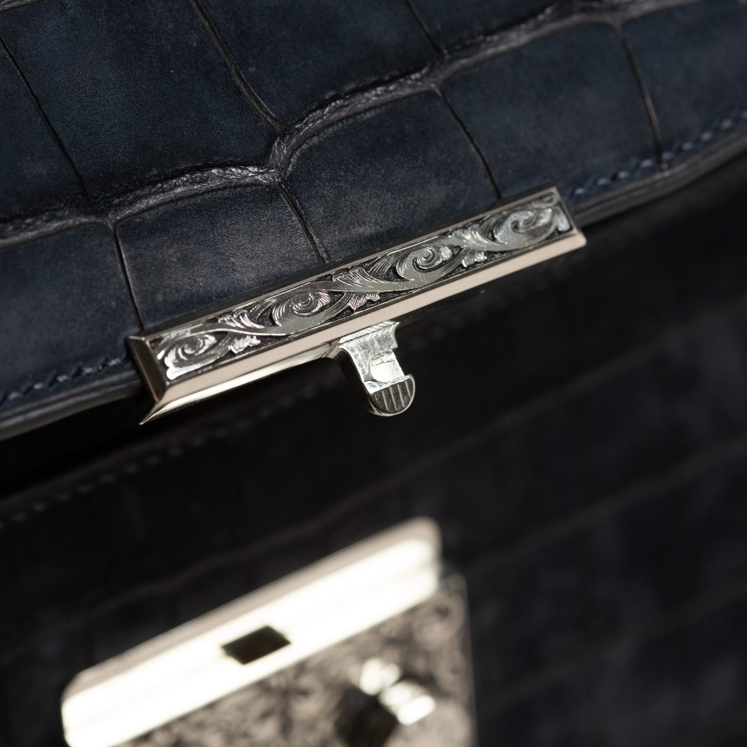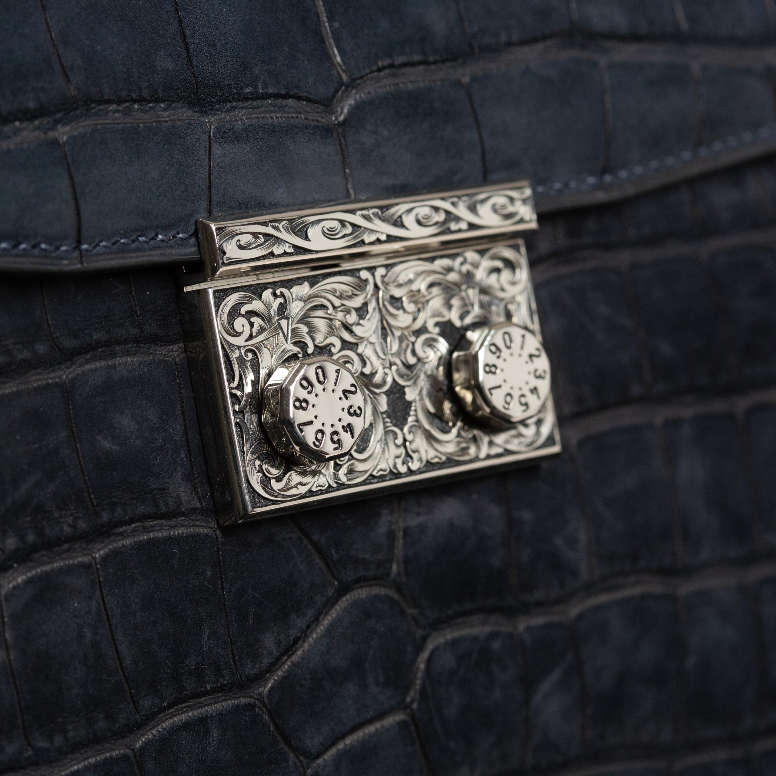 Set against the luxurious Nubuck crocodile leather—a premium material treated with a light surface buffing to create a soft, matte finish while retaining its characteristic robust structure—the overall piece evokes a graceful contrast: simultaneously soft and powerful; both classical and modern.