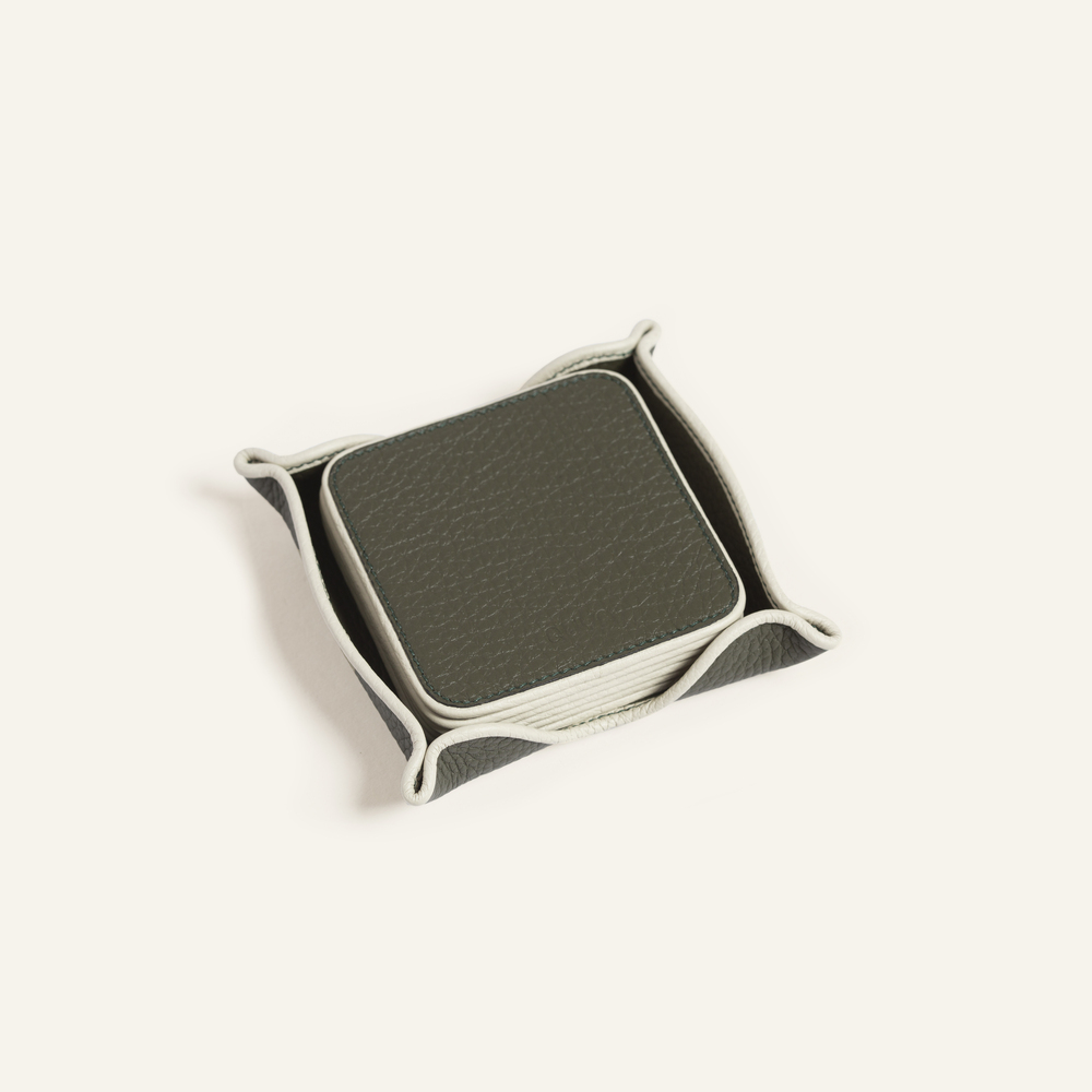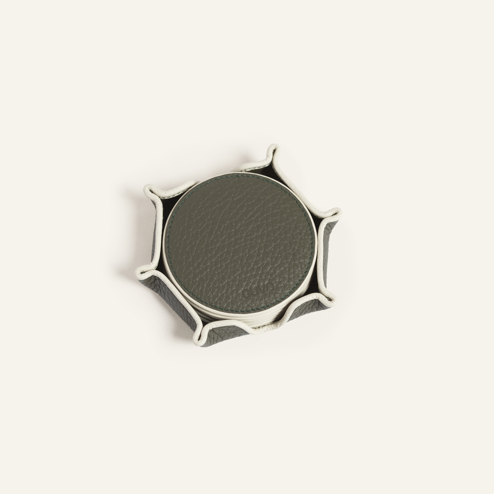 In a calming moss green hue, QUYN coasters serve as an elegant accent for any contemporary space. Meticulously handcrafted from high-end leather and featuring delicate Arterié details, the set embodies a distinctive and sophisticated aesthetic.